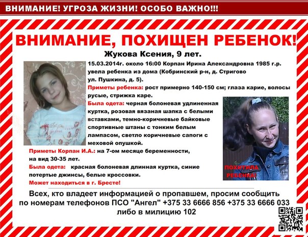 Поиски девочки начались после того, как 15 марта в 22.20 в Кобринский РОВД обратилась мать пропавшей, жительница деревни Стригово 1978 года рождения. Она сообщила, что в этот день предположительно в 15.00 ушла из дома ее дочь Ксения, и до настоящего времени ее местонахождение неизвестно. Женщина полагает, что дочь была похищена ее дальней родственницей, уроженкой Украины, 28-летней Ириной Корпан, которая несколько дней гостила в их доме и исчезла вместе с девочкой.