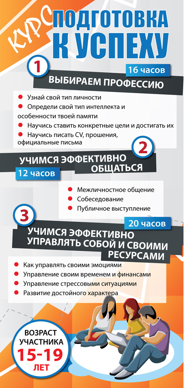 Предлагаем тем, кто стоит на пороге выбора профессии, хочет научиться активно общаться и управлять собой и своими ресурсами пройти 16 часовой курс "Подготовка к успеху". Плюс к вашим услугам обучение английскому разговорному языку.