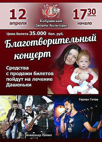 12 апреля (пятница) 2013 года во Дворце культуры г. Кобрин пройдет благотворительный концерт для Дашеньки Мацына. Девочка с рождения страдает редким заболеванием кожи и нуждается в нашей помощи.